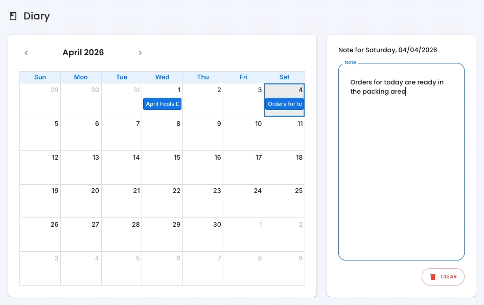 Take notes in your diary and share them with your team. Daily notes visible to everyone mean fewer miscommunications and a smoother day for everyone on the floor.